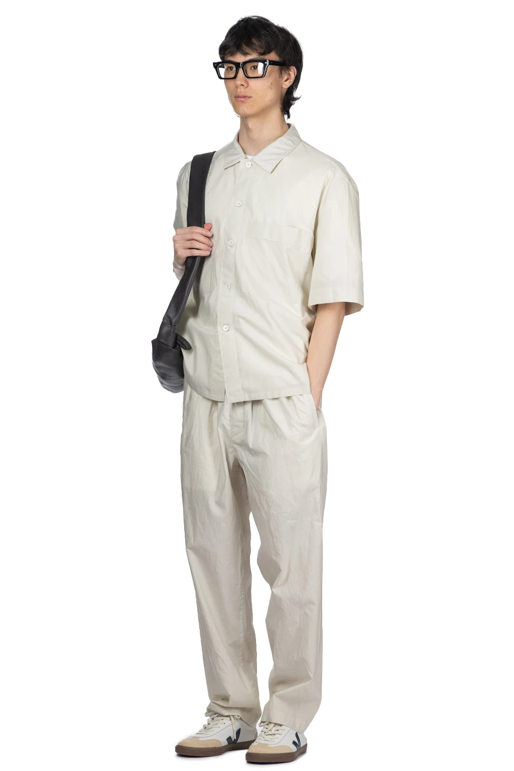 This shirt is a new addition to the Pyjama family, an iconic line of LEMAIRE’s wardrobe made of garments that can be worn indoors or out while maintaining an equal level of freedom and comfort in the movement. It is made in a blend of cotton and silk that has been washed, granting the garment fluidity and lightness. The Short Sleeves Pyjama Shirt features slightly nibbling seams, a centered button placket and two patch pockets on the front.